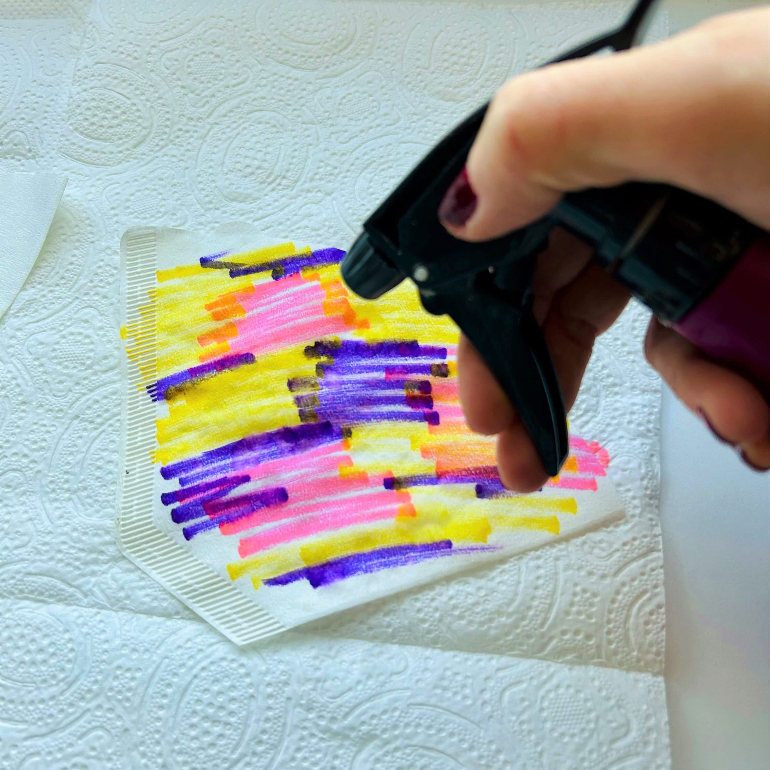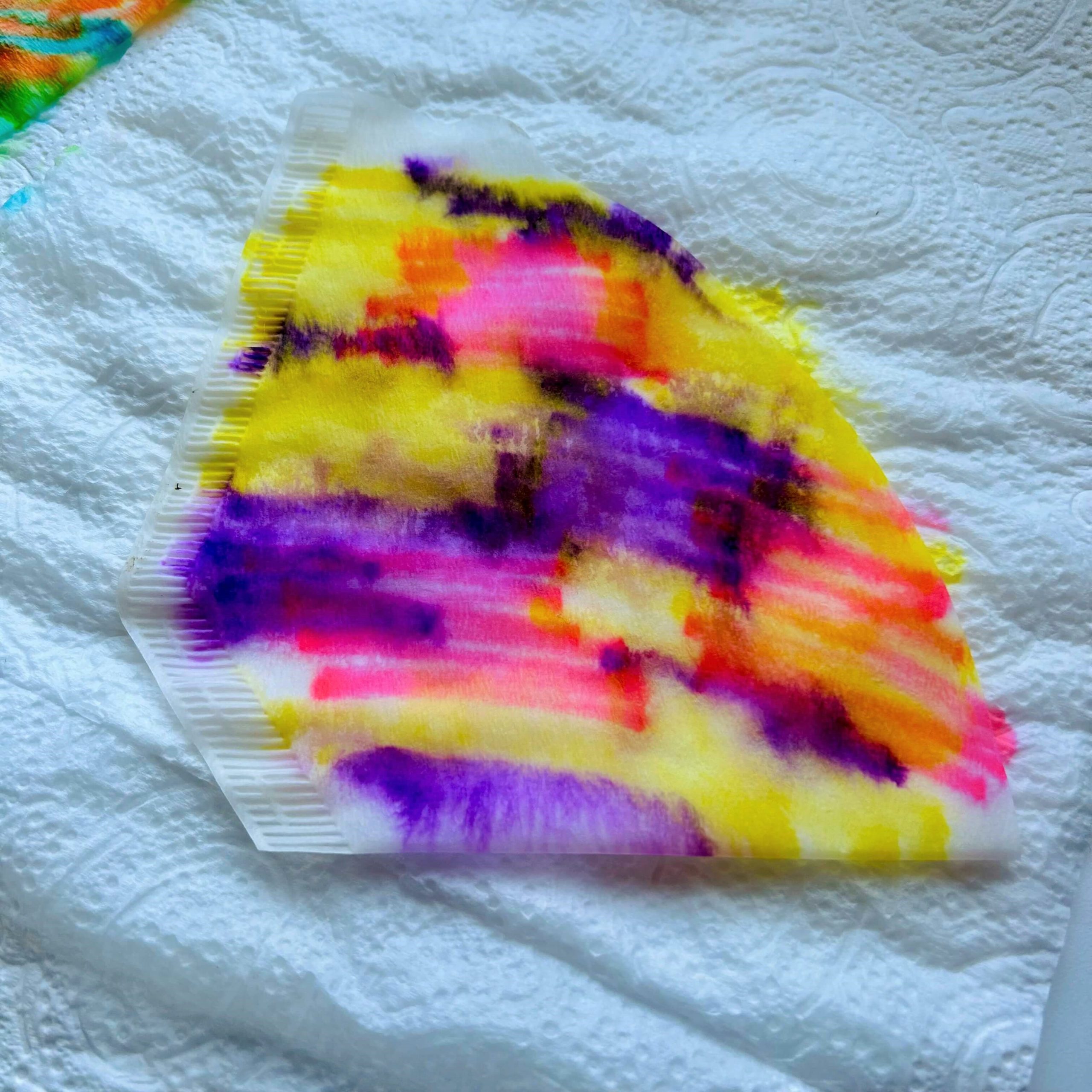 Spray a little water on the colored coffee filter. Be careful, you must protect the surface of the table well so as not to have any marks.