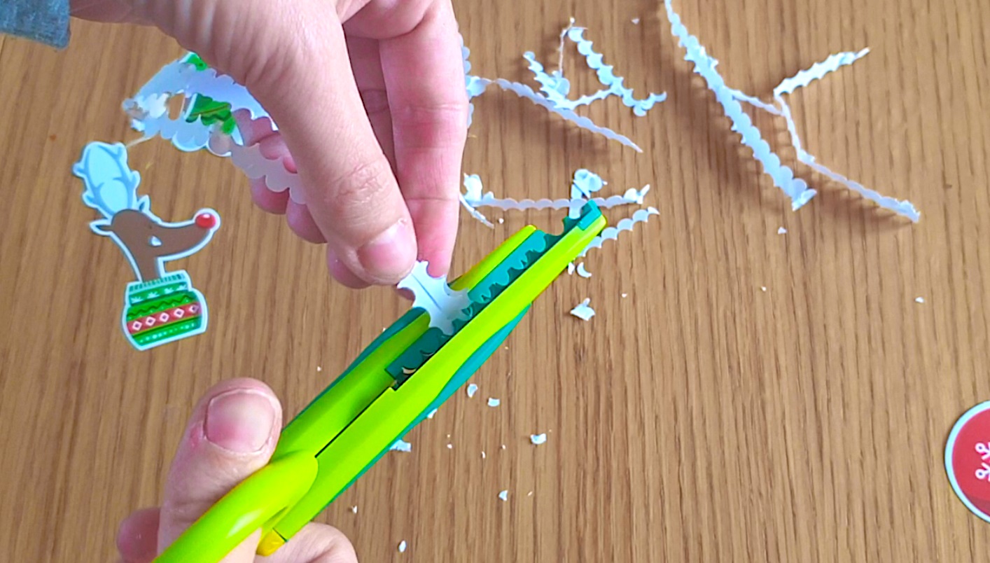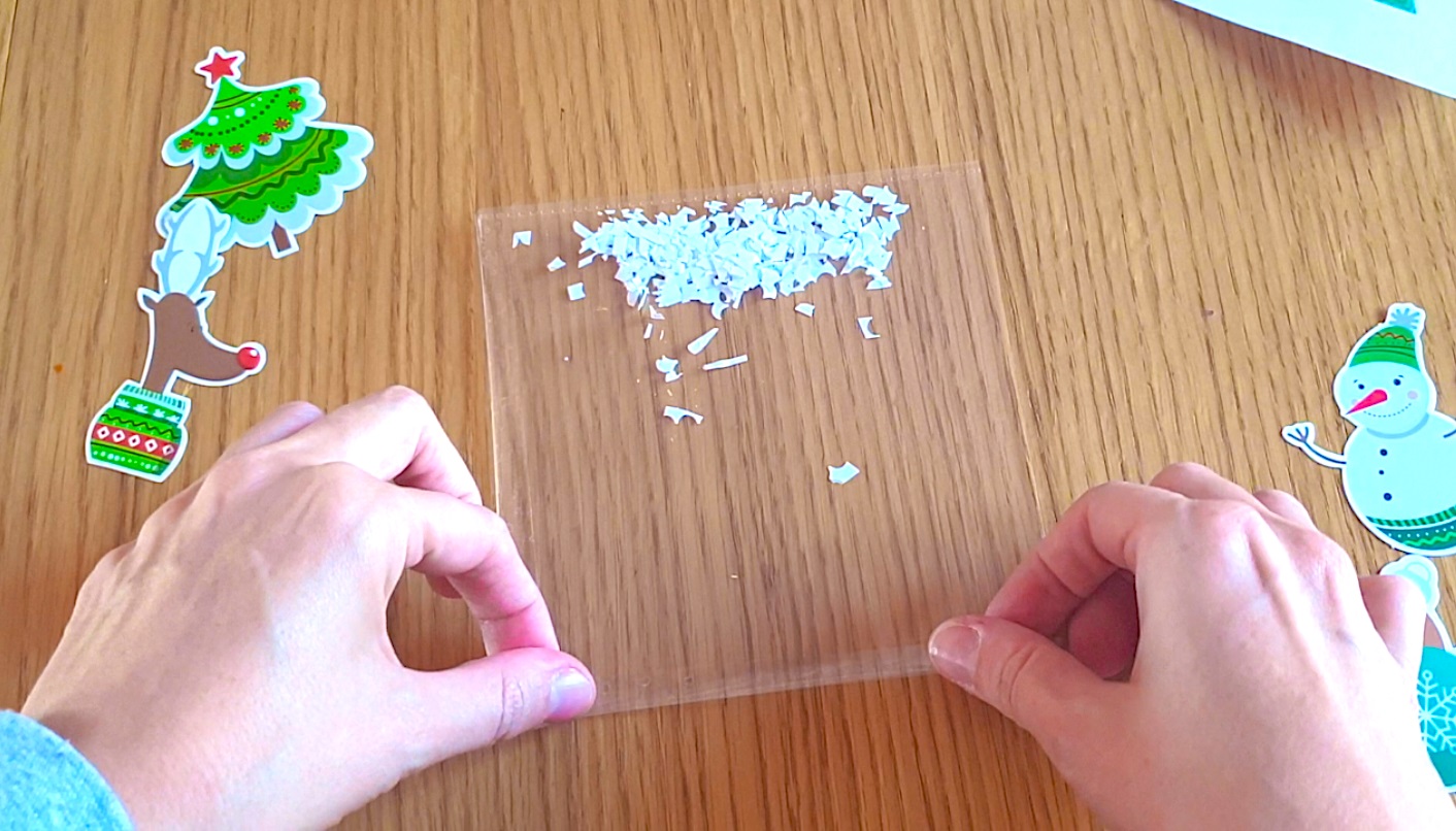 To create the snowflakes, cut thin strips of white paper with the serrated scissors. In one direction, then in the other; you’ll get lots of little pieces of paper this way to create the look of snow! You can also add some silver glitter for a sparkly effect.