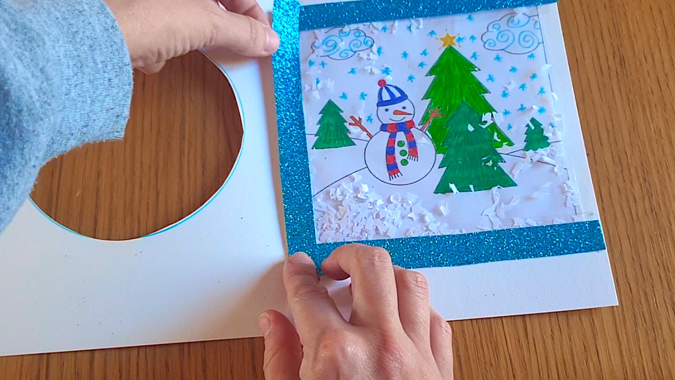 Glue down the colouring and then tape the snowy plastic on top. And to make it even prettier, decorate with glitter strips of paper or masking tape!