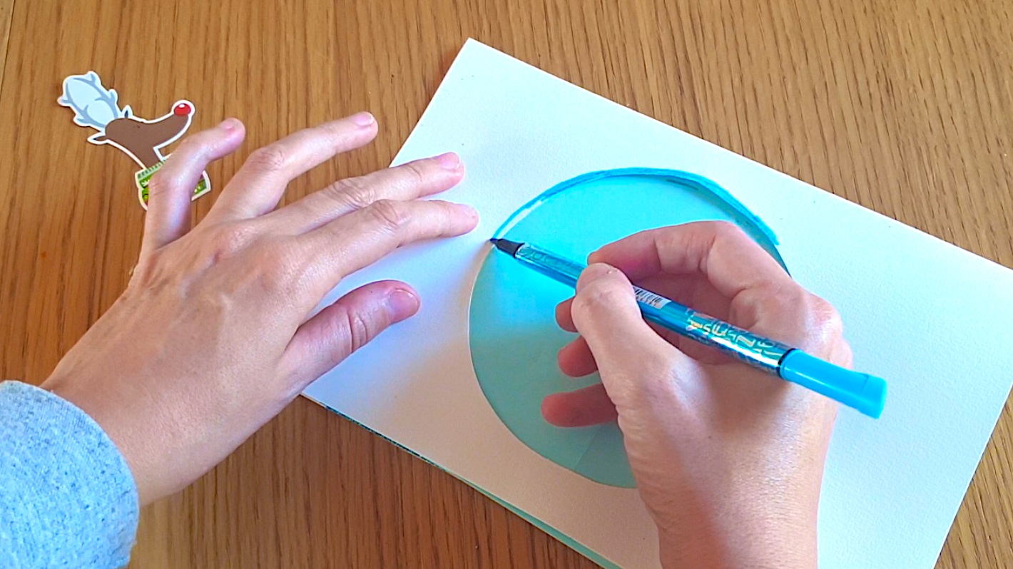 The card is almost finished, time to add the base of the snow globe, the outline with a marker, small drawings and a festive message.