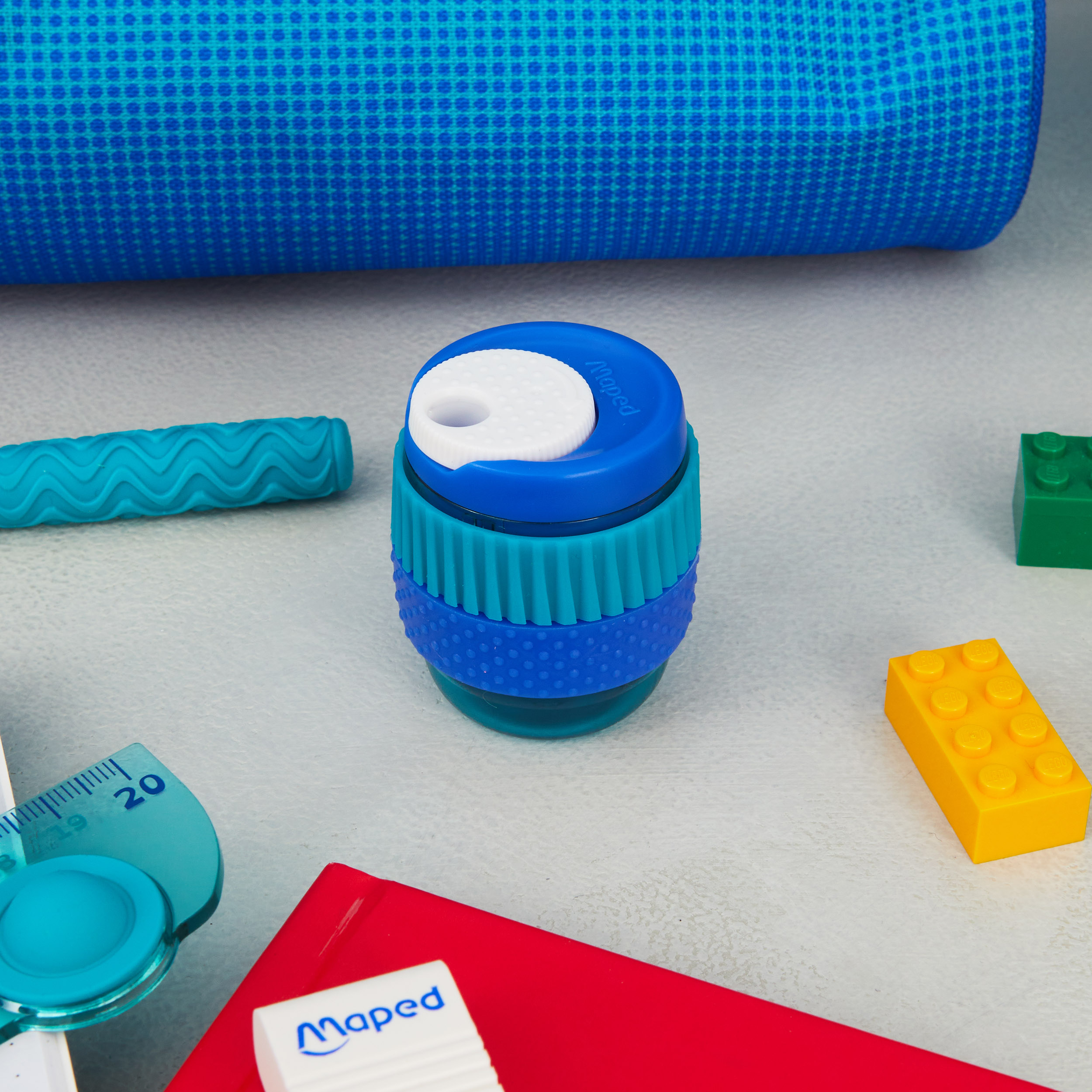 Pencil sharpener with shavings compartment and sensory features.
